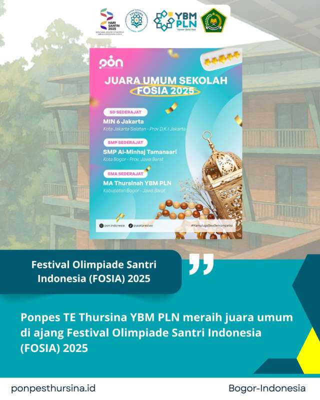 Bogor – Indonesia. Prestasi membanggakan kembali diraih oleh Pesantren Tahfizh Entrepreneur (TE) Thursina YBM PLN pada awal tahun 2025. Dalam ajang Festival Olimpiade Santri Indonesia (FOSIA) 2025—sebuah kompetisi nasional bergengsi bagi para santri—MA Thursinah YBM PLN sukses merebut gelar Juara Umum Tingkat SMA/MA Sederajat, mengungguli peserta dari berbagai provinsi di Indonesia.